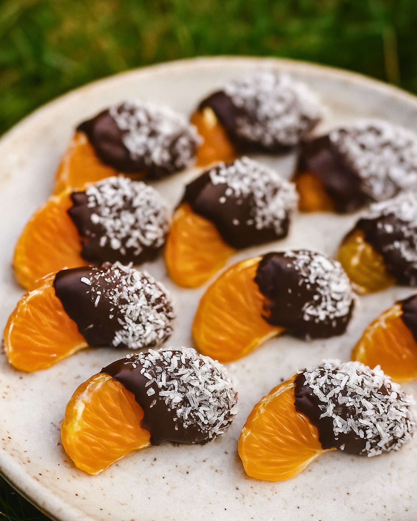 A narancsgerezdek egyik végét mártsd az olvadt csokoládéba, majd helyezd őket egy tányérra.Ha elkészültél mindegyikkel, a csokoládés részt szórd meg kókuszreszelékkel, és tedd hűtőbe 2–3 órára, hogy a csokoládé megdermedjen.