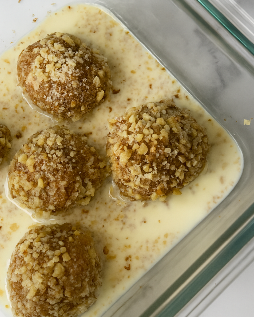 Kis golyókat formázunk, amelyeket megforgatjuk a darált diós-eritrites keverékben.